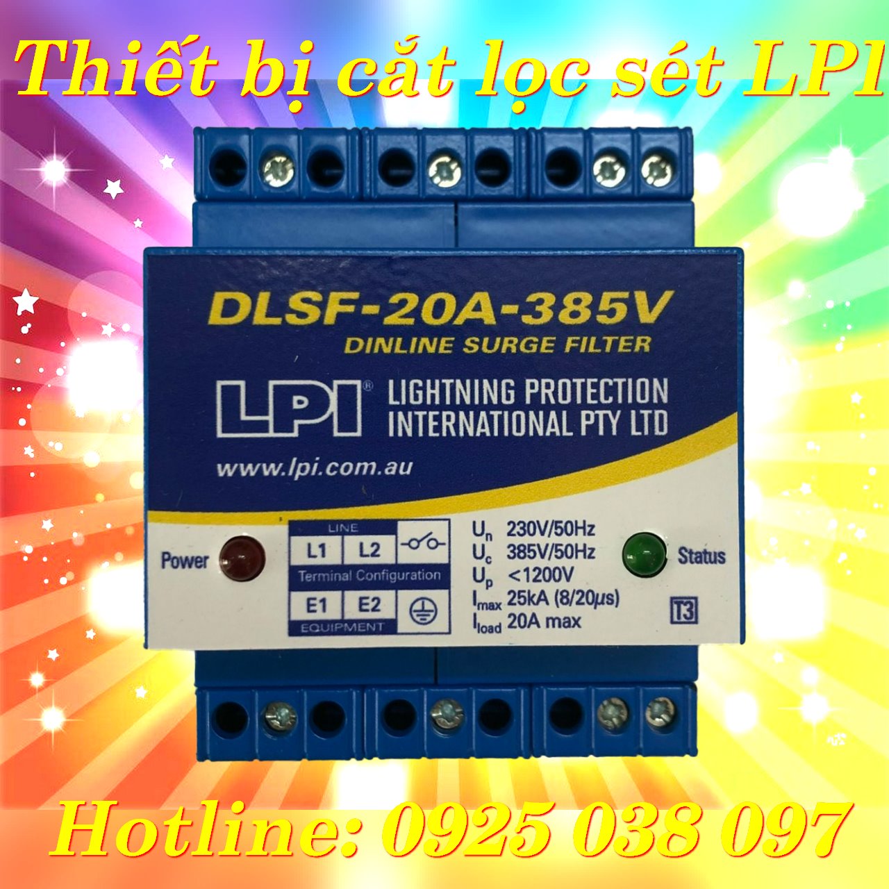 Thiết bị cắt lọc sét 1 pha DLSF-20A-385V 20A lắp nối tiếp CB, dòng tải tối đa 20A, điện áp định mức Un =277 VAC (Điện áp hoạt động tối đa Uc=385 VAC) Ph-N. Dòng cắt sét tối đa Imax = 25+25KA ; N-E Dòng cắt sét tối đa Imax = 25KA 8/20us, Cảnh báo: Hiển thị trạng thái làm việc bằng đèn báo; Có khả năng kết nối cảnh báo với các thiết bị cảnh báo bên ngoài thông qua tiếp điểm khô.